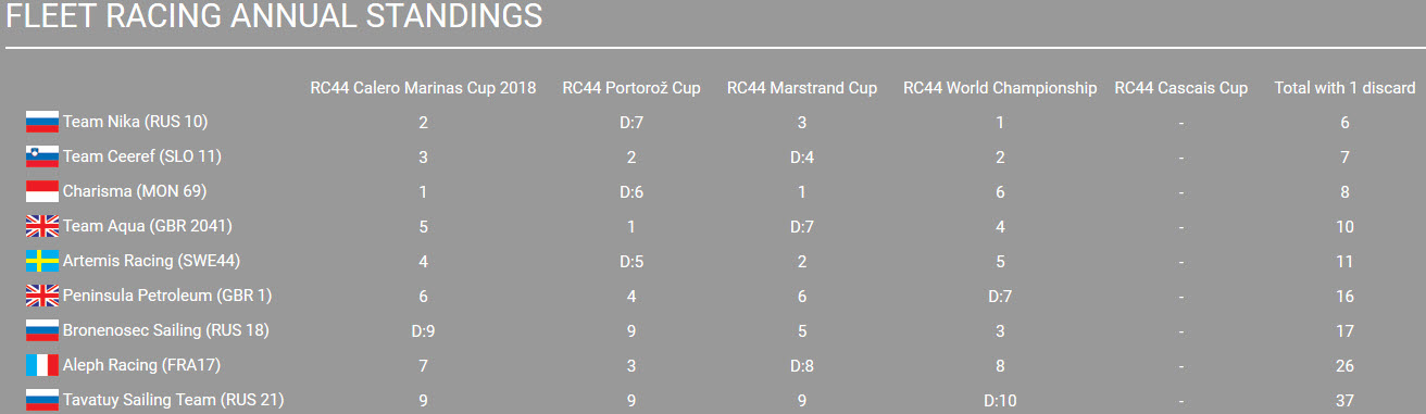 Elsewhere Hugues Lepic’s Aleph Racing and Torbjörn Törnqvist’s Artemis Racing both had better days while a sixth place overall for Nico Poons’ Charisma was not the result the Monaco-based Dutchman had hoped for to help his prospects for winning the 2018 RC44 Championship.