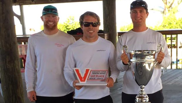 The 2018-19 Viper Winter Series got underway with 26 boats on December 15-16 in Sarasota, FL. For the first event of the 3-stage series, light winds allowed for four races on day one but failed to build for any racing on day two. Christopher Stocke (above) posted all top three scores to take the first event, finishing one point ahead of Marcus Eagan with Peter Beardsley one point further back in third.