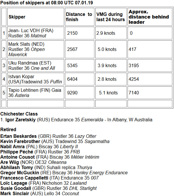 (January 7, 2019; Day 191) – As Golden Globe Race leader Jean-Luc Van Den Heede continues his climb up the North Atlantic to the finish at Les Sables d’Olonne, the French skipper has served out his 18 hour penalty on January 5 for improper use of his satellite phone (related to his mast damage) and is now clear to race the remaining 2,150 miles. He expects to arrive there on January 26.