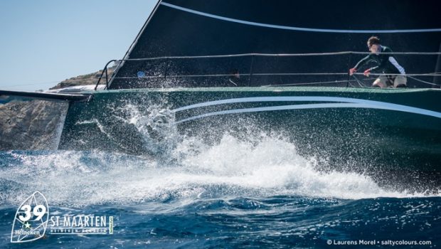 Saturday’s racing at the St Maarten Heineken Regatta saw one of the most exciting starts and closely fought first beats for the Maxi class, with the massive maxis close tacking along the shoreline before heading off on a 10 mile beat to Mancel. The fleet was then sent north to Le Tintamarre rounding the island anticlockwise.