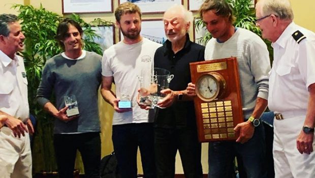 Scott Kaufman won the 2019 Etchells North American Championship on May 9-11 in Shore Acres, TX. In the 17-boat event, Kaufman with crew Lucas Calabrese, Austen Anderson, and Diego Stefani (above) finished tied with Marvin Beckmann after seven races but got the title on countback. Two points back in third was Shannon Bush with Bruce Burton in fourth overall and claiming the Corinthian title. Details.