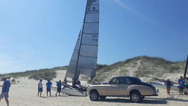The sandy shores at ORV Ramp 49 in Hatteras this afternoon were not only filled with Race Committee and ground crews, but veterans of many Worrell races past and fans alike. Local news crews clambered to interview the current and past racers. A local gentleman with a converted Rolls Royce for beach driving made an appearance – asking to have pictures taken with the racers and their boats.