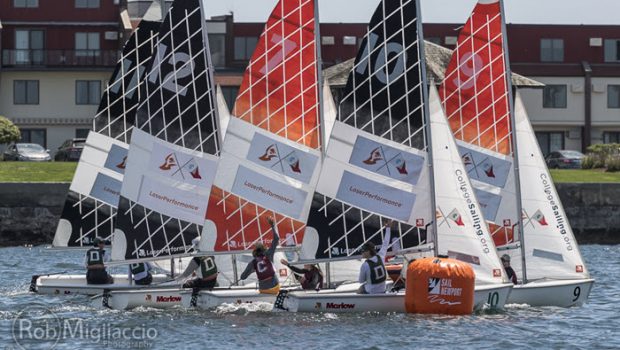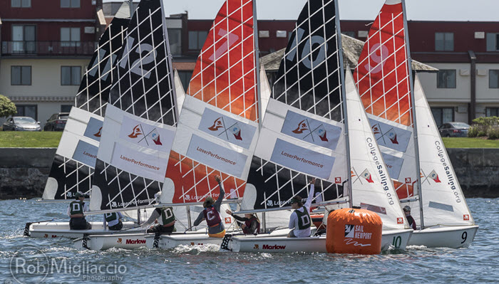 Newport, RI (May 26, 2019) – The second day of racing in the LaserPerformance Team Race National Championship was a full day as the sixteen top teams in the nation were cut down to the top eight and finally the top four today.