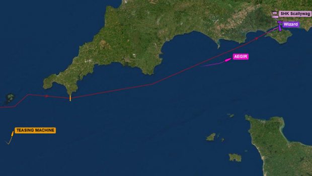 Eric De Turckheim’s 54-footer Teasing Machine is also struggling with light winds and foul currents in the English Channel. Teasing Machine is about 150 nautical miles astern of Aegir, but still has to clear the Lizard Point gate, which lies about 57 nautical miles to the northeast.