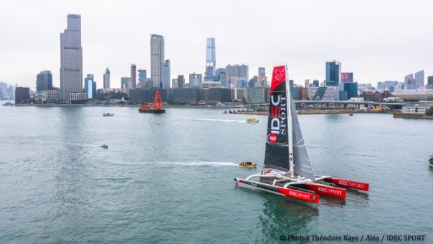 (January 18, 2020) – The IDEC SPORT maxi trimaran is back racing. Francis Joyon left Hong Kong this morning at 08:00:47 hrs UTC and is on his way to London in the framework of another record attempt: the Tea Route, for which the reference time has been held since 2018 by the Italian, Giovanni Soldini and the crew of the Maserati trimaran, who completed the voyage in 36 days, 2 hours and 37 minutes. To beat the record, Joyon and his crew have to finish in London by 11:36:58 on Sunday February 23rd.
