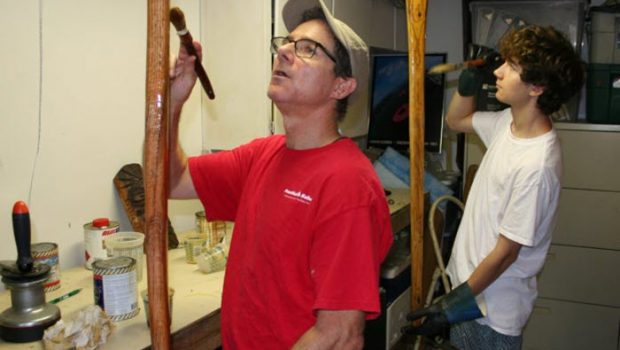 As for me, I’m in no rush to get on the water. There will be time for that. The lull in waterfront activity has allowed me to catch up on some long-delayed work projects with my younger son Jake (above photo). At present we’re on a brightwork binge, with hatchboards and tillers lined up in the garage (doors wide open, and well-ventilated with fans, of course) awaiting another coat.