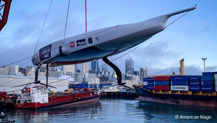 Auckland, New Zealand (June 29, 2020) – Defiant, the first AC75 racing yacht built for New York Yacht Club American Magic, Challenger for the 36th America’s Cup, has arrived in New Zealand. The AC75 was shipped through the Gulf of Mexico, transited the Panama Canal and then crossed the Pacific after departing from the team’s winter base in Pensacola, Florida on May 28.