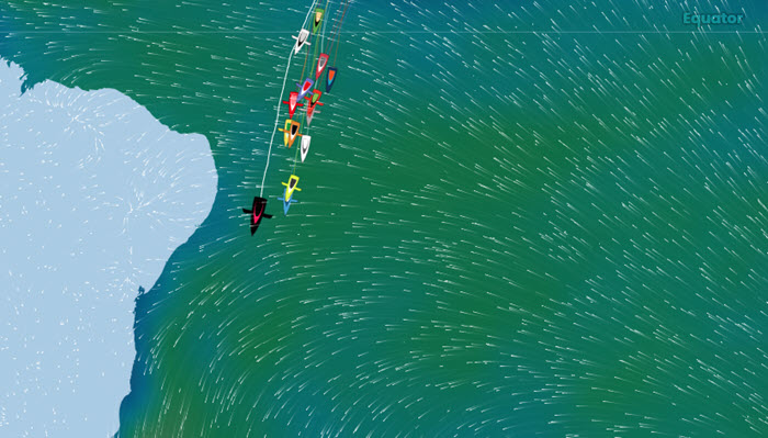 Now 130 nm off the Brazilian coastline, Thomson saw his cushion shrink on the rankings today to less than ten miles, some of that due to the way the theoretical route is calculated on the official charting. His margin enlarged again this afternoon after the moving waypoint to which the leaders are racing, was recalibrated slightly west.
