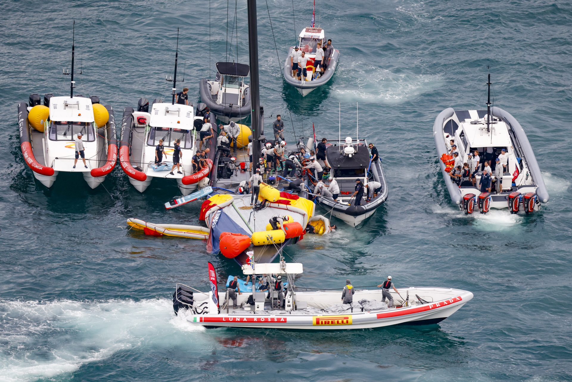 With the hull taking on water, the call was issued for support, and American Magic received rapid assistance from the three other America’s Cup teams, along with America’s Cup Event Ltd, the race management team, the Coast Guard New Zealand, the Auckland Harbormaster, and local fire and police personnel.