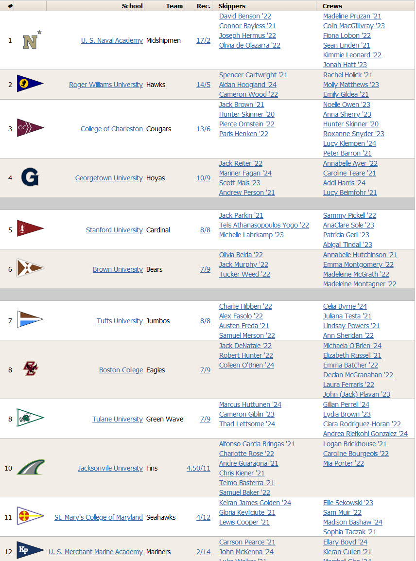 Sailing for Navy was: David Benson ’22, Connor Bayless ’21, Joseph Hermus ’22, Olivia de Olazarra ’22, Madeline Pruzan ’21, Colin MacGIllivray ’23, Fiona Lobon ’22, Sean Linden ’21, Kimmie Leonard ’22 and Jonah Hatt ’23.
