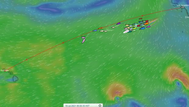 That could be the Farr 57 Ho’okolohe which started on July 13, has led since the jump, and today had less than 1000 miles to go at 0800 HST. Or could it be the turbo Volvo 70 Pyewacket 70 which started on July 17? That would be fun too.