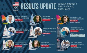 “Today it was complicated sailing, and at any moment where there seemed to be a roadmap, things would change,” said McNay, a four-time Olympian. “It was a challenge to get one’s bearings, but it was within our grasp to do so. It’s a bit frustrating to not have walked away with finishes equal to our best positions in each race. There are multiple races left and we will fight with everything we have.”