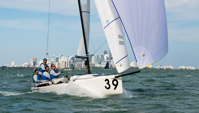 Miami, FL (January 29, 2022) – Day 2 at Bacardi Winter Series dawned as forecast with a big breeze of 27+ knots and gusts up to 39 on Biscayne Bay, forcing the three fleets – J/70, Melges 24, and 69F – to be postponed ashore.