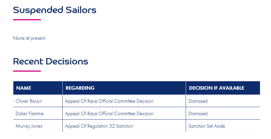 Disciplinary and appeal decisions within World Sailing are determined by Independent Panels appointed by the Judicial Board. Decisions made by Member National Authorities (MNAs) are decided by the disciplinary systems of those MNAs.