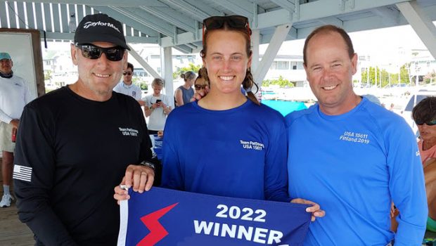 Wrightsville Beach, NC (May 21, 2022) – After posting the low score of 2-2 on day three of the 2022 Lightning World Championship to take the lead, David Starck (USA) with crew Tom Starck and Jenna Probst finished off the job today with a 4-DNF to win the title. A 50-boat fleet completed the 8-race series on May 18-21, with Tito Gonzalez (CHI)/ Alberto Gonzalez, Jr./ Zeke Horowitz finishing second and Javier Conte/ Martina Silva/ Trinidad Silva (ARG) in third.