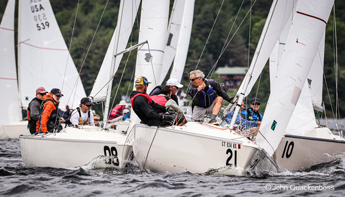 Nefarious (USA 384), skippered by Bob Lawrence and Paul Sevigny, won six of ten races to claim the 2022 Sonar World Championship on June 16-18 on Lake Sunapee, NH. With crew Victor Diaz de Leon and Willem van Waay, Nefarious dominated the 22-boat fleet with Andreas Josenhans 15 points back in second, while Brian Doyle was a point further back in third. – Details