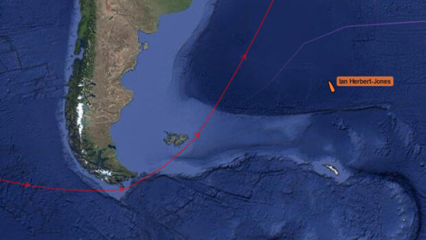 (April 10, 2023) – Ian Herbert Jones (GBR), who had been racing his Tradewind 35 PUFFIN in the Golden Globe Race, had his boat roll over and dismast, with the skipper injuring his back and incurring a gash to his head. His location was northeast of Cape Horn when he became overwhelmed in winds gusting over 90 knots and a confused sea.