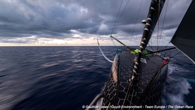 “The deck is dry, but the wind is very shifty,” said Seb Simon on GUYOT environnement – Team Europe who have moved up in the fleet. “This morning we could see Biotherm which was a nice surprise. It will be like this all day (generally light, gusty, clouds). It’s nice but we’d like a little bit more speed.”