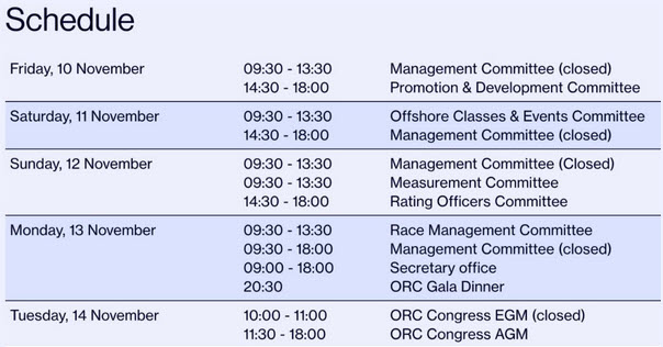 Six committees – Management, Promotion and Development, Classes and Events, Race Management, Measurement, and Rating Officers – will meet November 10-13. Each will have an agenda of items that will include a review of the past year and the Submissions suggestions for future improvements. Their recommendations then go to the ORC Congress for approval at its meeting on November 14.