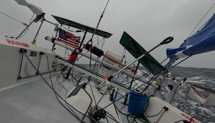 Knowing this wind direction would not last forever and my relative position in the fleet, sleep was not going to happen. I stayed up all night hand steering most of the time to maximize the boat speed, surf waves, and prevent the boat from wiping out. While the auto pilot is great, it had difficulty with the boat being powered up and with the wave direction that night. Furthermore, when I start wiping out, or broaching, it is usually time to switch to a smaller sail. – Full report