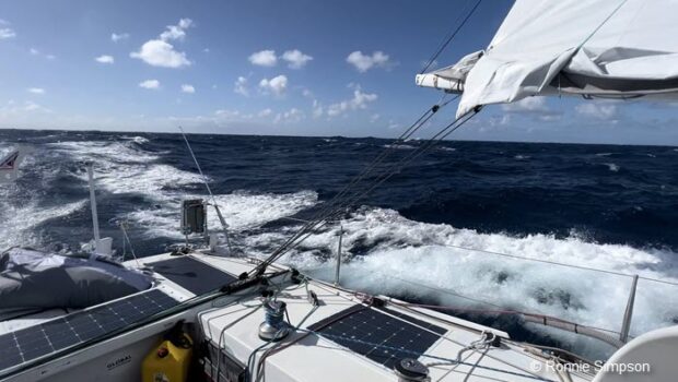 She’s overtaken all other boats and, in particular, all those that left the week before her and all those in her group of starters on October 28. She’s certainly setting a demanding pace and giving Ronnie Simpson on his vintage Open 50 a run for his money.