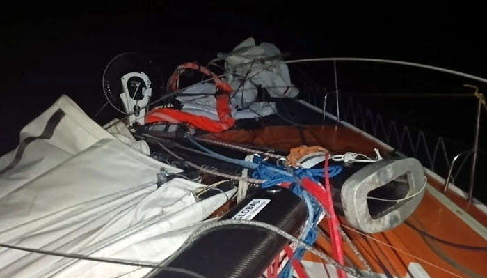 Känsäkoski immediately lowered all sails hoping to be able to secure the mast at first light and even, perhaps, manage a makeshift Dyneema replacement D1 to allow him to sail on to Australia. However, a squally front was headed his way and despite winds of just around 20 knots, the boat under bare poles rolled violently enough to cause the unsupported mast to break in half in the depth of night.