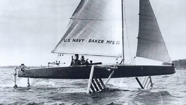 Monitor carried cotton sails and could foil in around 13 knots of wind on two ‘ladder foils’ forward and a submerged foil at the transom. Early speeds were around 25 knots, and in October 1956 it hit over 30 knots, sailing at twice the windspeed. It is now at The Mariners’ Museum and Park in Newport News, Virginia.