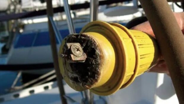 Barring improper use or some owner fabricated MacGyverism gone bad (jury-rigged adaptors, botched plug installations, etc.) overheating and corrosion are the primary causes of AC shore power cord problems. Charred plugs and receptacles are the most common and are a result of resistance build up due to loose or corroded connections, which in turn generate heat and the potential for fire. The problem is especially prevalent among boats that continually run high energy loads such as water heaters and air conditioning units.