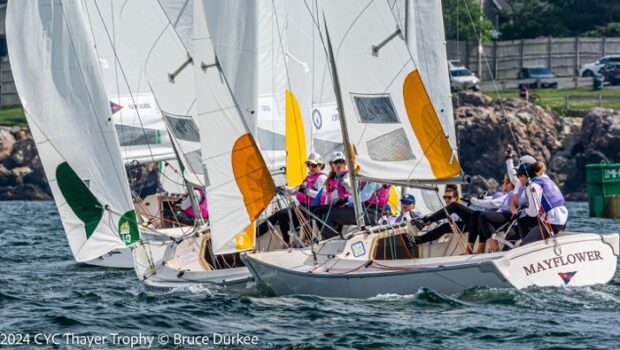 Looking to create more opportunity for women sailors to compete at a high level, the Corinthian Yacht Club introduced the Thayer Trophy regatta in 2021. It is the only women’s 3v3 team racing event held in keelboats with spinnakers, which add a degree of difficulty that has become a hallmark in the upper echelons of team-racing competitions. Racing is held in club-provided Sonars, 23-foot, one-design keelboats typically sailed with four or five crew.