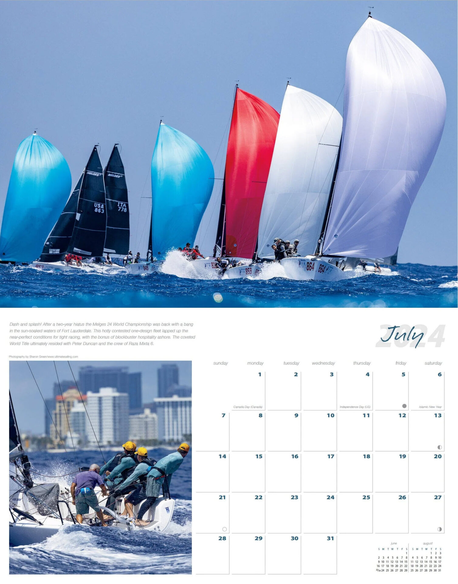Who wouldn’t want to climb aboard one of these Melges 24s and enjoy the brisk spray, during these dog days of summer? The July images in the 2024 Ultimate Sailing Calendar feature the Melges 24 World Championship captured by Sharon Green, and bring a cooling breath of fresh air as summer heat blankets the land.