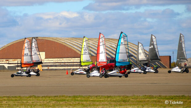 The vast airfield provided the perfect course for high-speed land racing. With runways stretching two miles long and 300 feet wide, the vast space allowed organizers to set up a variety of challenging courses, from figure eights to long windward/leeward legs, with 11 races completed for two divisions: GOLD (for experienced sailors) and SILVER.