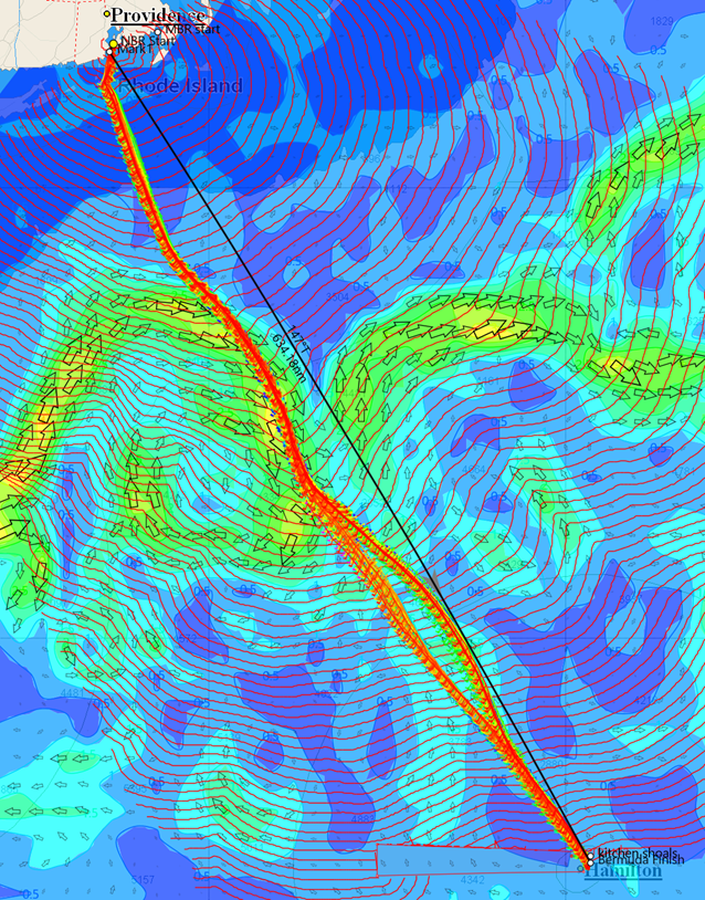 In hindsight the use of F-TCF was a very fortuitous decision by the Bermuda Race Organizing Committee. Figure 1 shows the optimal routes for perhaps half of the fleet. The figure shows a very strong favorable Gulf Stream meander just west of the rhumb line according to the weather routing technology. The slower boats in the fleet were helped more by this favorable current.