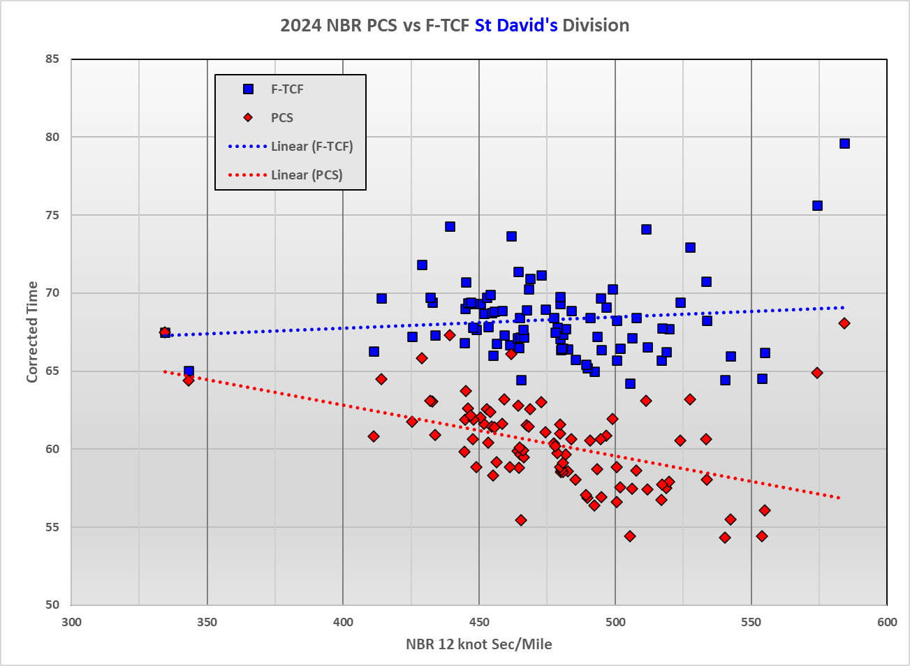 In contrast, the F-TCF corrected times, blue squares and blue dashed trend line, show how this scoring method leveled the field. The trend line is horizontal, the best of the fastest boats had corrected times close to those of the best of the slowest ones.