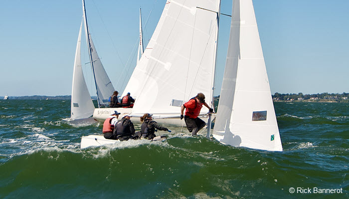Brian Doyle from Lake Sunapee (NH) Yacht Club conquered big waves and wind to win the 2025 Sonar North American Championship on September 20-21 in Darien, CT. Doyle, sailing with Shane Wells, Kelsey Wheeler, and Steve Kirkpatrick, won five of eight races to win by 10 points over Tom Kinney with Erin Maxwell in third.