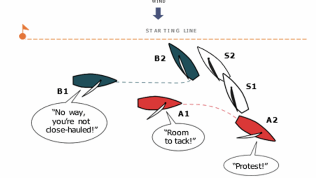 Boats A and B are reaching up the starting line on port tack with 30 seconds to go to the starting signal. There are no boats astern of B. As A approaches Boat S, on starboard tack, A hails, “Room to Tack!” B responds, “No way, you’re not close-hauled!” A bears away, sails astern of S and hails, “Protest!” B sails for two lengths and tacks to leeward of S.