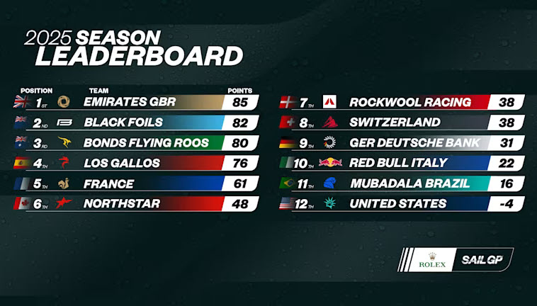 Over the course of the 2025 Season, a total of $12M USD is up for grabs – the largest prize purse in the sport of sailing. $9.6M has been doled out so far, with $2M up for grabs to the Grand Final winner, and $800,000 available to the top-three placed teams in the Abu Dhabi event final. So far this season, Emirates GBR top the prize money leaderboard with $2M in the bank, followed by the Black Foils with $1.76M. The BONDS Flying Roos and Los Gallos have each secured $1.2M.