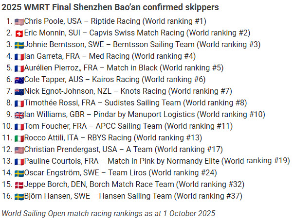 The World Match Racing Tour (WMRT) has named 16 skippers for the 2025 World Match Racing Tour Final to be held January 6-11, 2026 in Shenzhen, China. After the 16-stage season, the top competitors will now compete for the Match Racing World Champion title and a share of the USD200,000 prize purse.