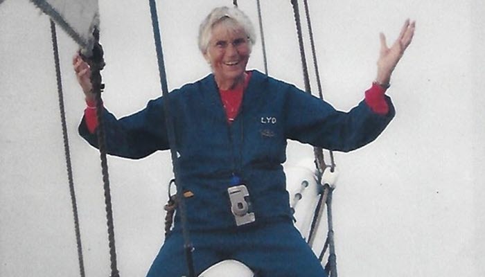 Leaving that position, she spent a transformative year and a half sailing with maritime legends Captain Irving Johnson and his wife Electa (Exy) aboard the 96-foot brigantine Yankee. That 18-month voyage, which included 120 Ports O’ Call and rounded the Cape of Good Hope, shaped her future in profound ways.