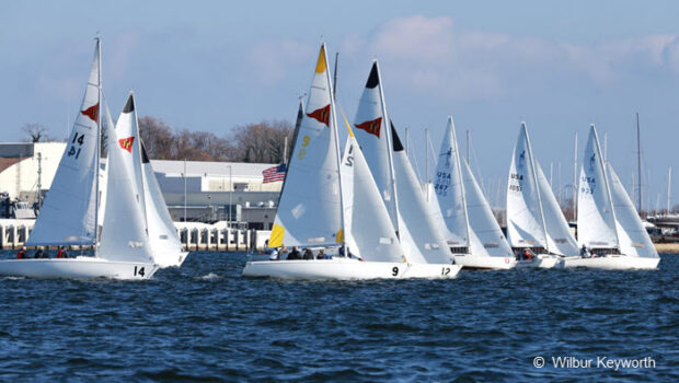 The Sonar fleet, for example, was paired with the J/22 fleet. The starting line and racecourse are the same, but fleets are scored separately. The Sailing Instructions required every boat to race with at least three crew for safety, and no spinnakers flown. – Full report