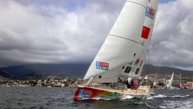 Wendy and Sanya Serenity Coast was first across the start line in Hobart, and continued to lead the rest of the Clipper Race fleet up the River Derwent.
