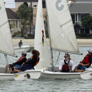 Second place finisher Jessica McJones and crew Gavin McJones (on left) fight it out with regatta winner Jacob Rosenberg and crew Madison Nadelman on Alamitos Bay in Long Beach, CA. (l-r) LBYC Junior Commodore Jack Berg ... Read More →