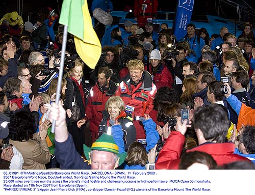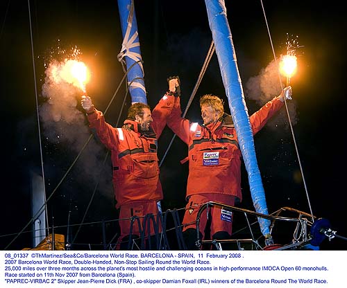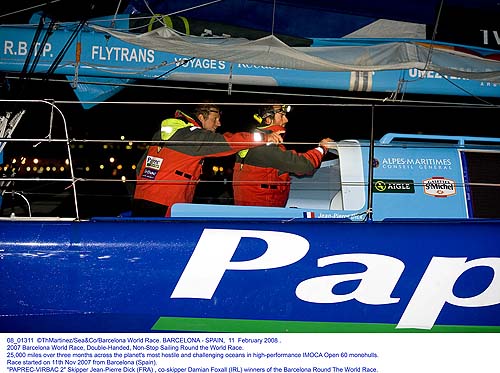 After 93 days at sea, exactly three months after the start, Paprec-Virbac 2 won the inaugural Barcelona World Race when skippers Jean-Pierre Dick and Damian Foxall crossed the finish line at 20:49 GMT Monday, February 11, 2008.