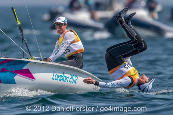 Gold medal 470 crew showing off their Olympic form. American Kevin Burnham in 2004 and Australian Malcolm Page in 2012. Photo by Daniel Forster/PPL.